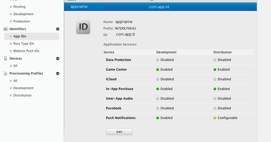 In order to setup push notification you need to edit package.json with the following values. Be aware to use exactly the names reported on the Apple developer portal for your App. In this example I’m using the ones reported in the following screenshot
